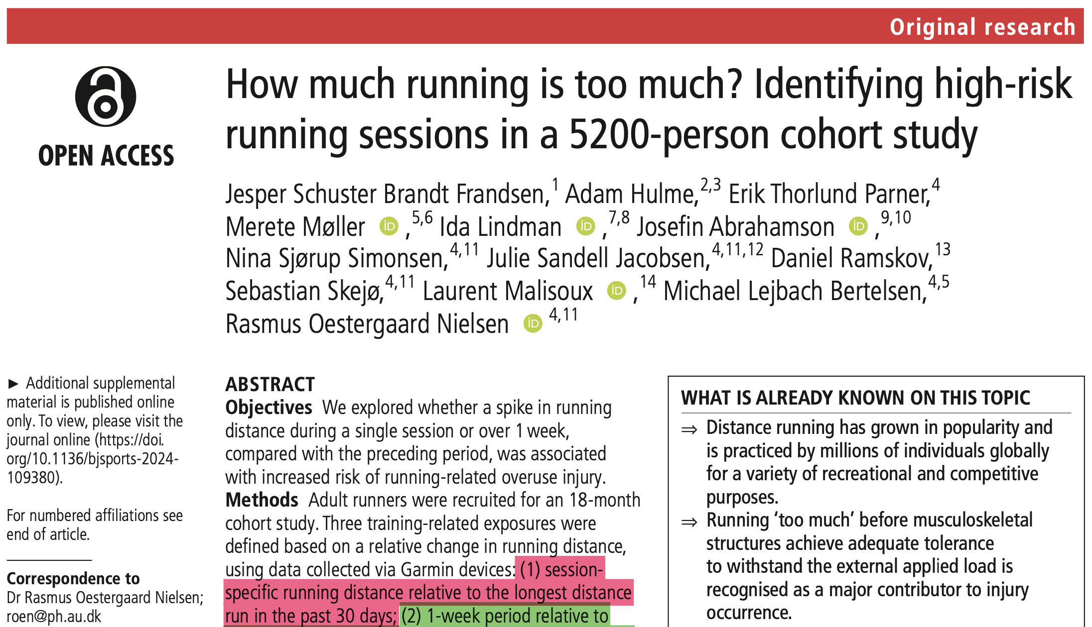 This 10% guideline comes from an 18-month study on 5,205 runners. Researchers tracked the distance ran for each individual session using data from participants' Garmin watches and used weekly questionnaires to log injuries. The goal was to find the exact point where injuries spiked.