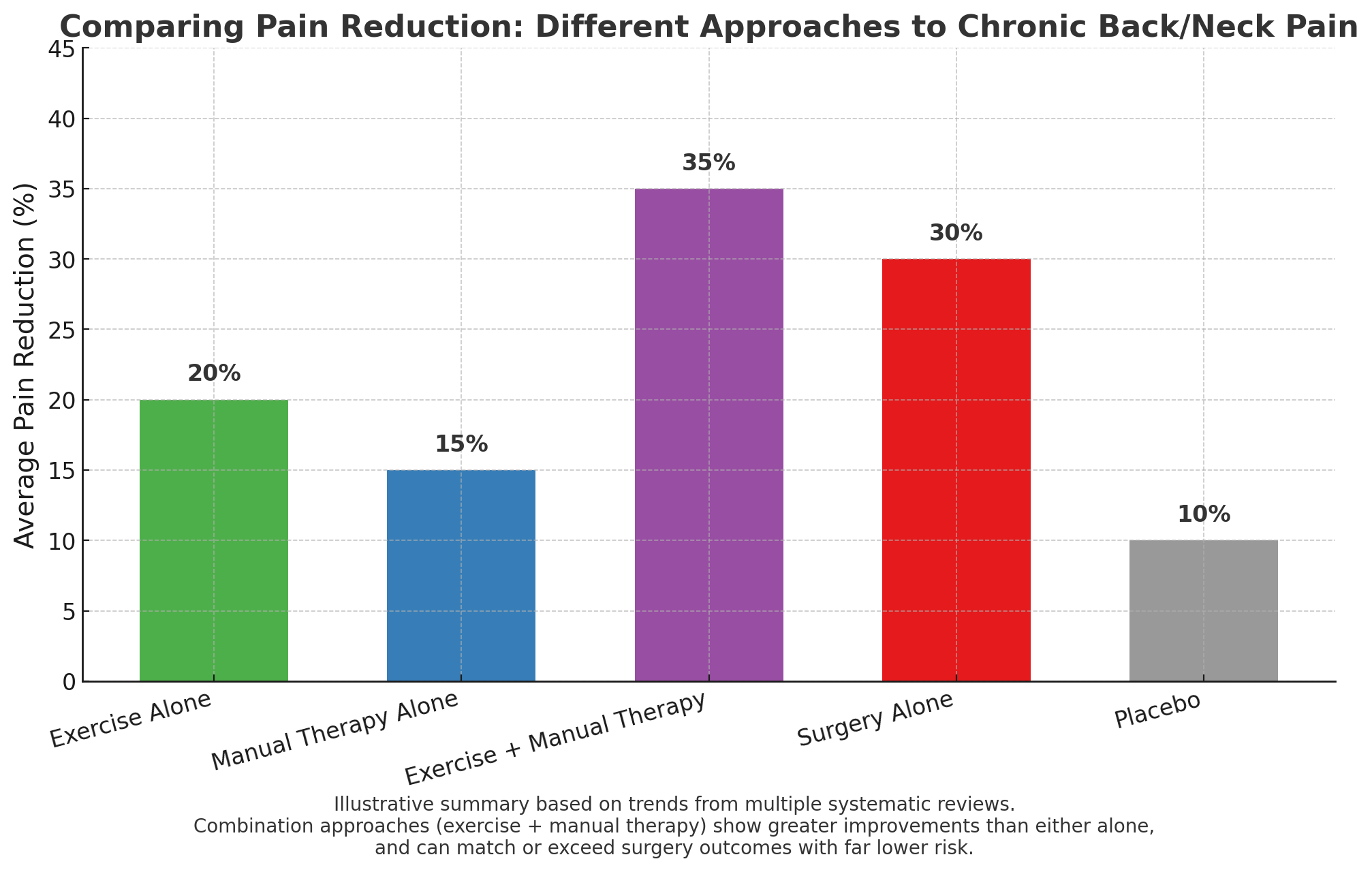 Exercise therapy typically improves pain by 6–8 points on a 100-point scale — a small but meaningful benefit for many people.